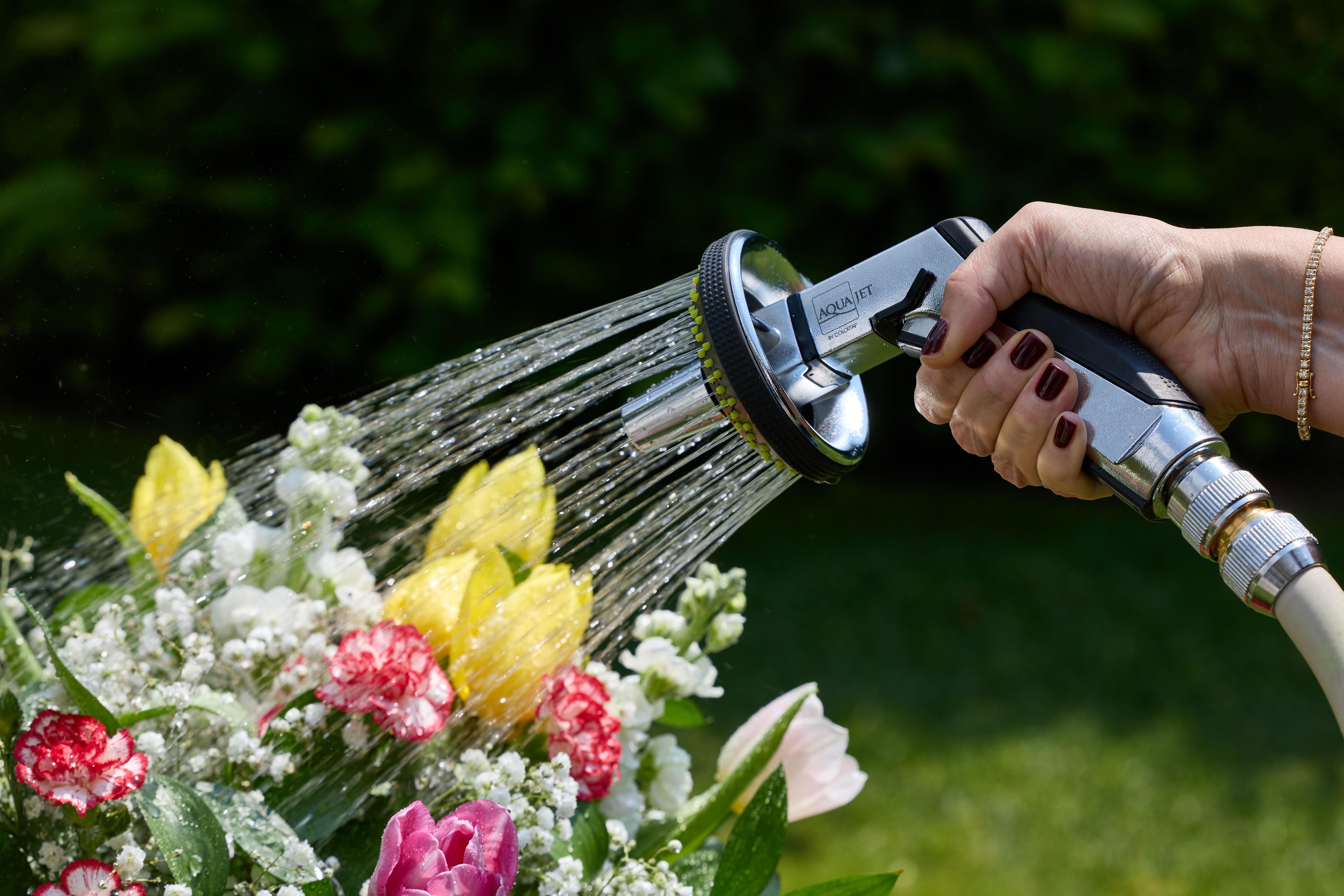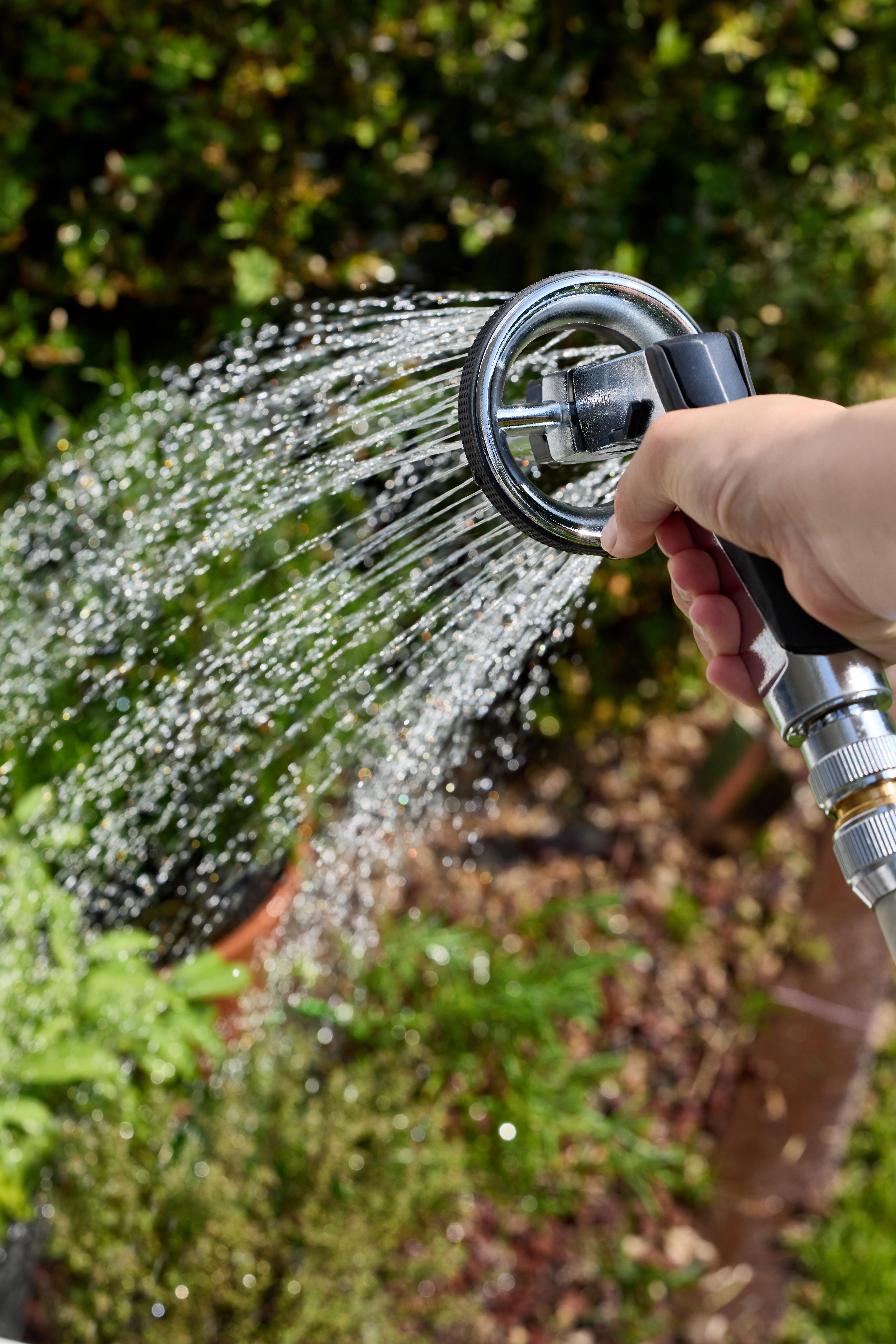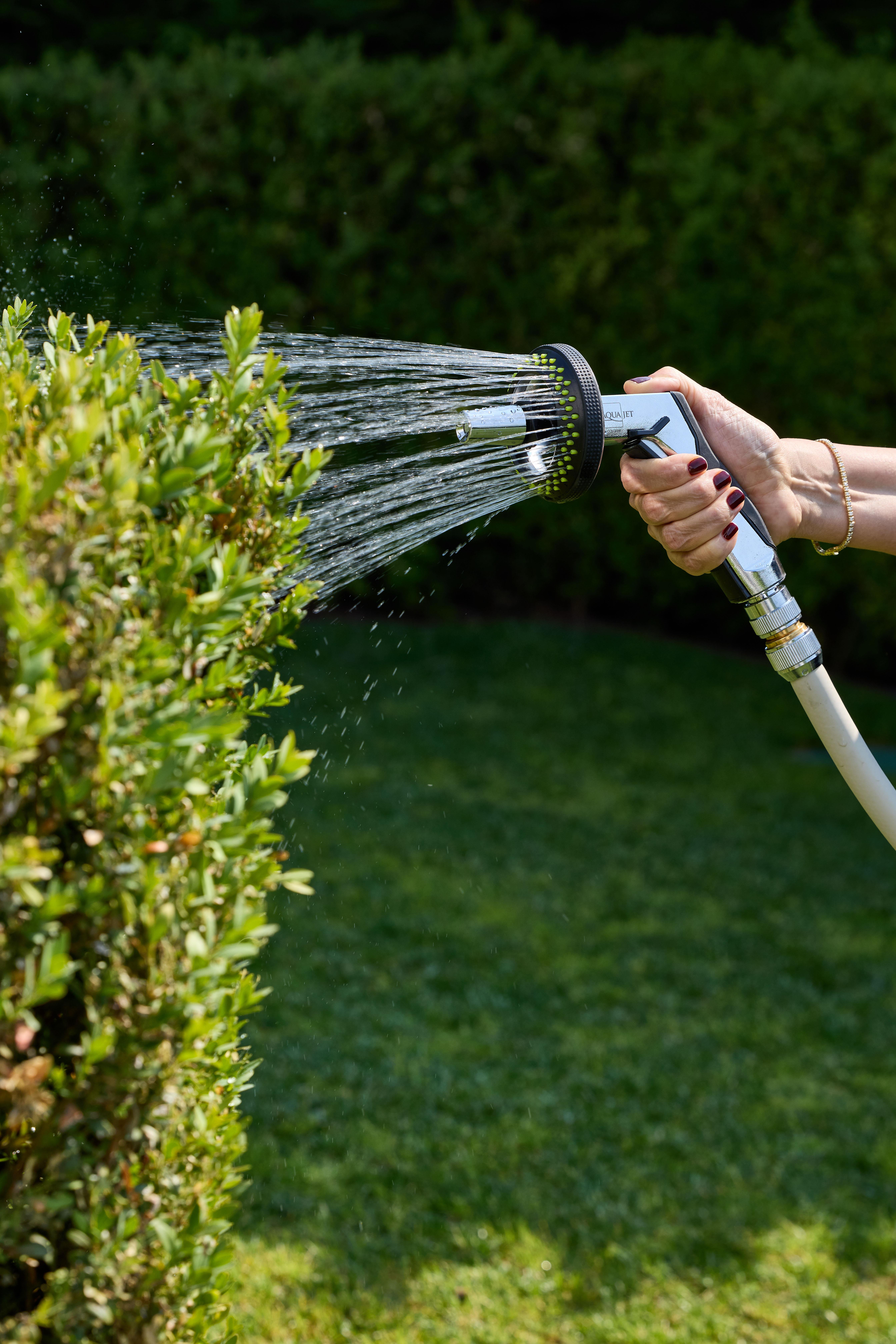 Diese hochwertige Garten-Handbrause aus robustem, verchromtem Metall ist für langlebige Einsätze und maximale Zuverlässigkeit konzipiert. Dank des ergonomischen Designs mit Frontsteuerung und einem praktischen, selbstverriegelnden Handgriff ist eine komfortable Einhandbedienung problemlos möglich. Der großflächige, rotierbare Brausekopf erlaubt den schnellen Wechsel zwischen zwei verschiedenen Sprühmustern, um für jede Anwendung die passende Wassermenge und -form zu wählen.